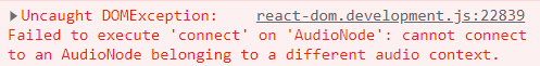 AudioNode 라는 것이 다른 context에 연결되어서 에러가 났다는 것이었다. 나는 분명 audio context를 새로 만들거나 다른 것에 연결한 적이 없었는데 위와 같은 오류가 떠서 해결하는데 많은 시간이 걸렸다.