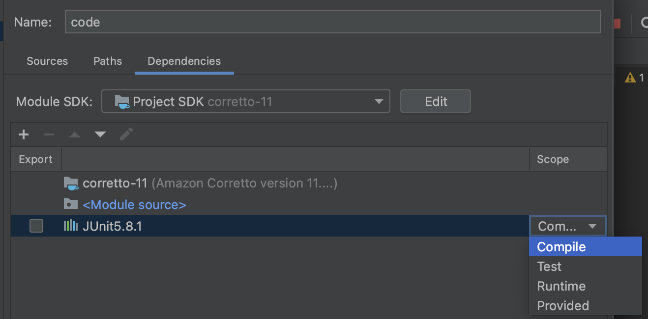 이렇게까지 하면 테스트 코드가 생성된다. 만약 아래와 같은 에러가 생성된다면 앞에서 들어갔던 Module setting 에서 Dependencies 로 들어간다. 그 후 JUnit5의 Scope 가 Test로 되어있을텐데 이를 Compile 로 바꾸면 된다.
