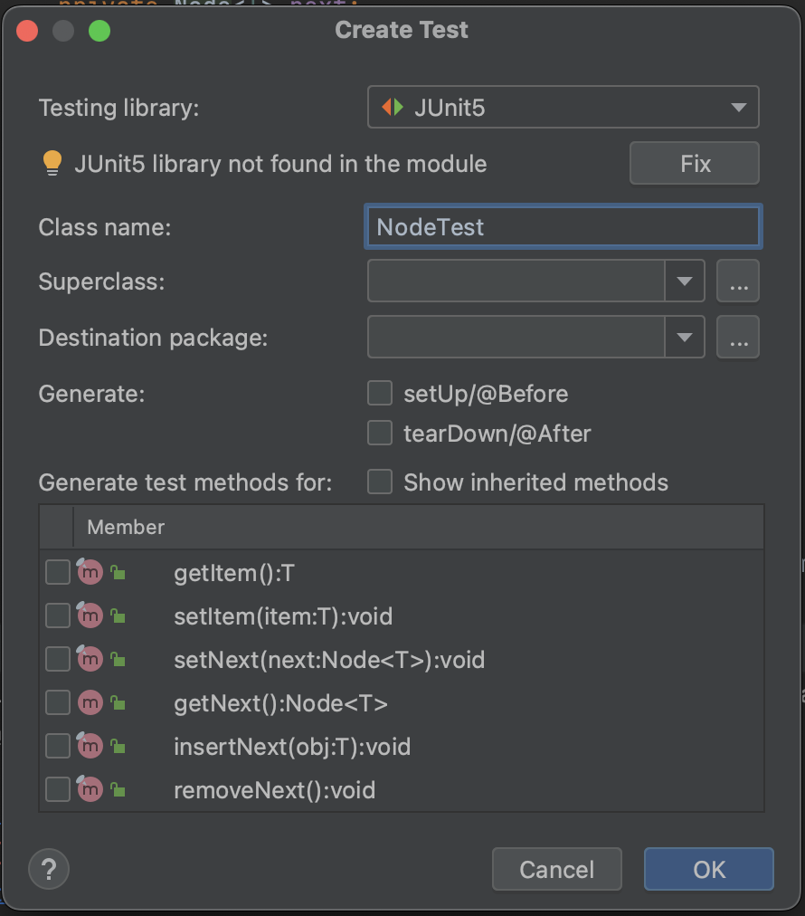 클릭하면 아래와 같은 창이 나온다. JUnit5 라이브러리가 없어서 Fix 버튼이 생기는데 버튼을 클릭 후 라이브러리를 다운 받고 아래 사진처럼 OK 버튼을 누르면 사라진다. 그리고 테스트 클래스 이름, generate 어떤 것을 할 것인지, 어떤 메소드의 테스트코드를 만들 것인지 선택하면 된다.