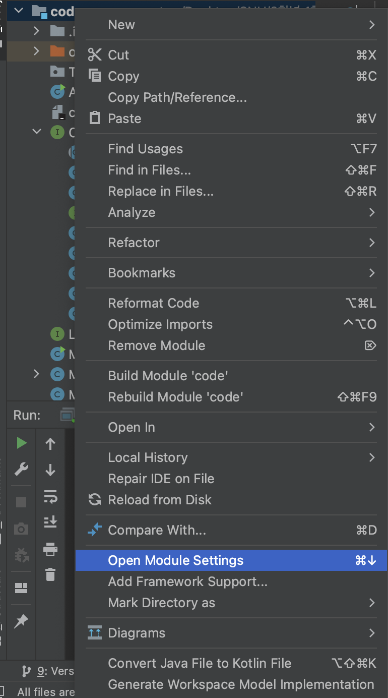 project root 폴더를 우클릭 후 Open Module Settings 을 클릭한다. 그 후 Test 폴더를 클릭 후 초록색 Tests 를 눌러서 테스트 폴더임을 설정한다.